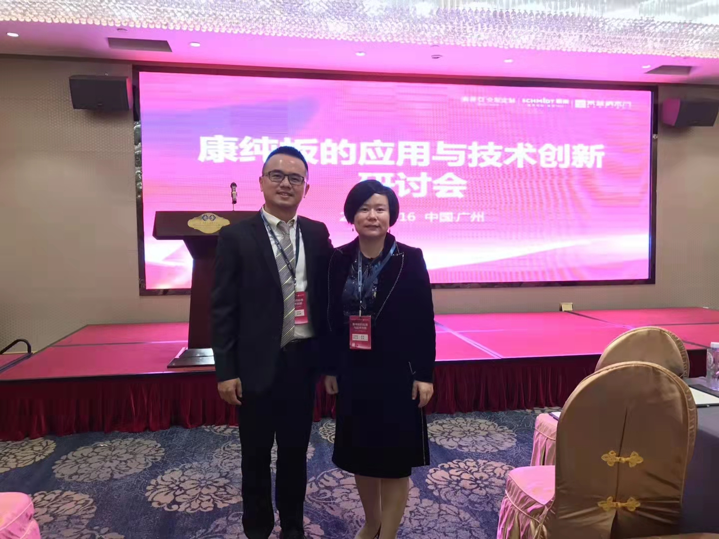 汪果在康纯板的应用与时候转换计划会上与索菲亚家居总工程师张挺合影。